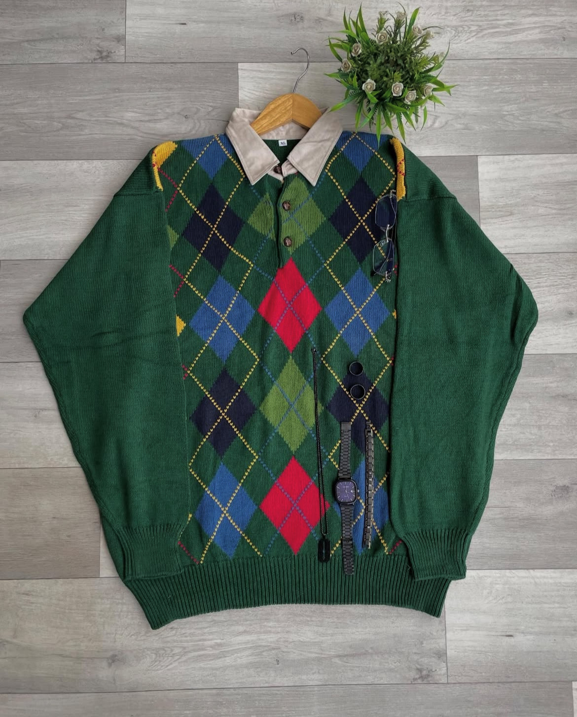 Classic men's outfit featuring tailored beige trousers with a green sweater sleeve accent, a vibrant green cardigan with colorful diamond patterns, a crisp white shirt, and glossy black loafers with chain details. Includes a matching watch and glasses for a stylish touch. Perfect for casual or semi-formal occasions!